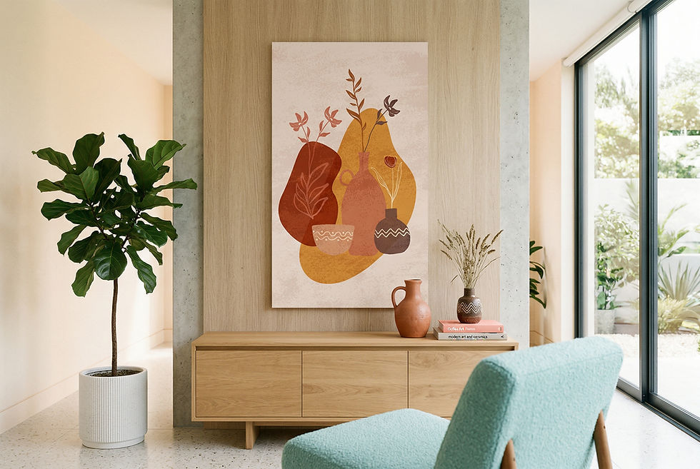 This minimalist boho painting features a centered arrangement of delicate botanical silhouettes and a dried floral sprig emerging from a textured, semi-circular base.